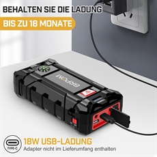 Jump starteren holder strøm i op til 12 måneder uden brug. De kraftige kabler sikrer optimal strømoverførsel ved opstart. Med både USB QC3.0-porte og Type-C-tilslutning kan du oplade forskellige enheder. Det indbyggede kompas hjælper med orienteringen, mens den robuste konstruktion beskytter elektronikken.