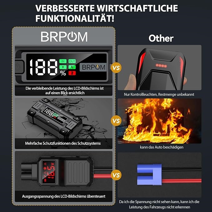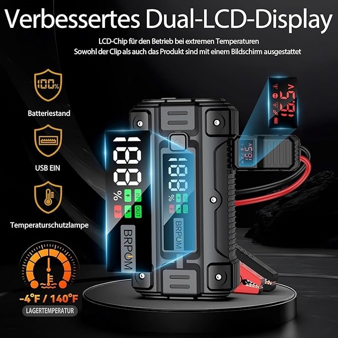 BRPOM leverer pålidelige løsninger til bilister, der værdsætter beredskab og sikkerhed. Det opgraderede kabel med længere og tykkere design forbedrer ledningsevnen, mens de 8 beskyttelsessystemer reducerer risikoen for skader ved forkert brug – især værdifuldt i ujævnt terræn eller under krævende forhold. Find flere batteriladere og boostere i vores sortiment.