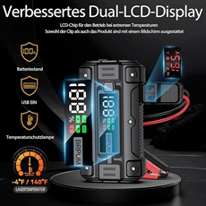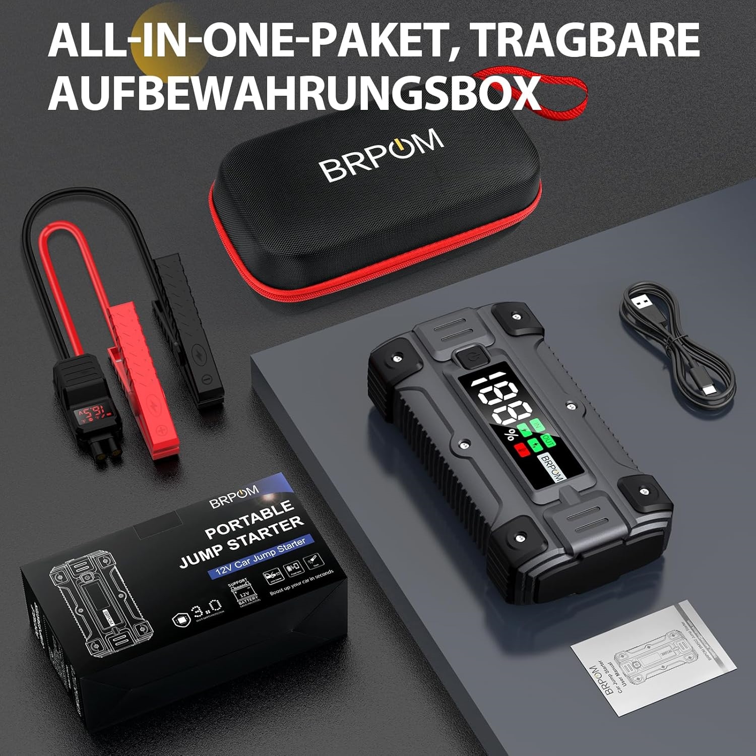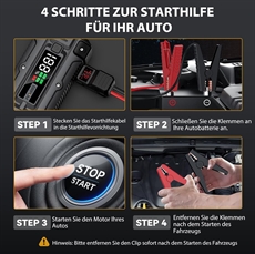 • Inkluderet: Jump starter, opgraderet kabel, opladningskabel og opbevaringstaske
