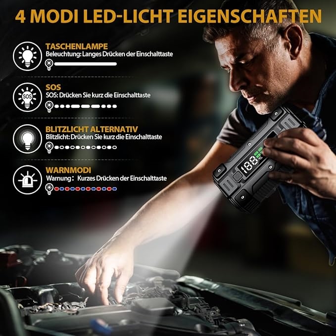 Ud over at starte din bil fungerer BM502 som en 26.800 mAh powerbank med 2 USB-udgange og 18W QC3.0, så du kan oplade GPS, smartphones og andre enheder under rejsen. 4 LED-tilstande – belysning, stroboskop, SOS og advarsel – giver ekstra sikkerhed i mørke eller nødsituationer. LCD-skærmen viser tydeligt batteristatus og driftsoplysninger, så du altid ved, om enheden er klar.