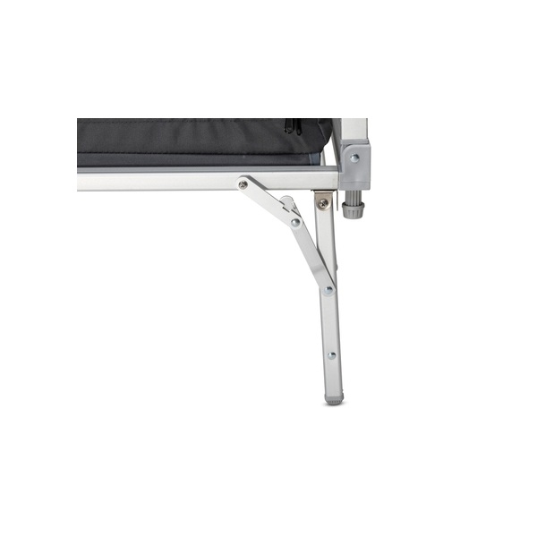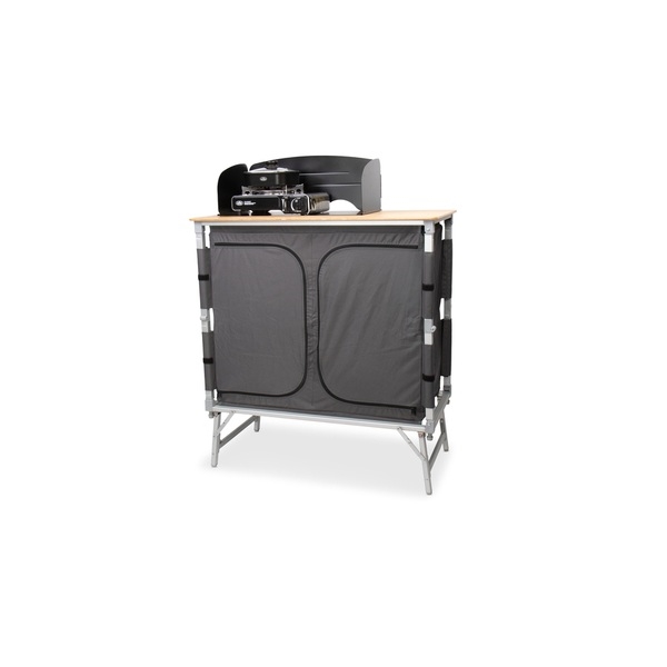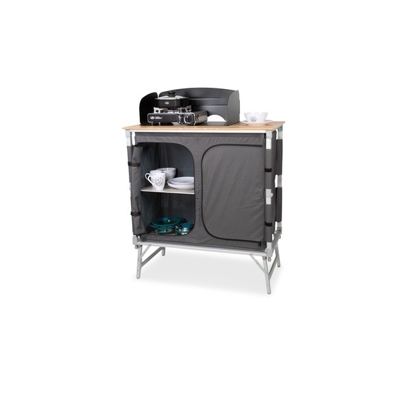 Dette campingkøkken kombinerer effektivitet med praktisk design. Det hurtige opsætningssystem gør det nemt at komme i gang med madlavningen, mens den justerbare højde fra 820 til 1070 mm sikrer komfortabel madlavning. Bambusoverfladen giver en robust arbejdsflade, og aluminiumsrammen holder vægten nede på kun 13 kg.