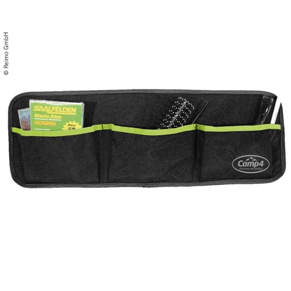 Sort vægorganizer med tre rum, limegrøn kant og Camp4-logo. Perfekt til småting.