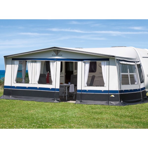 3-delt; alle segmenter kan tages ud og udskiftes indbyrdes; dermed kan indgangsdøren flyttes til alle andre positioner af forstykket; indgangsdør kan flyttes og rulles op; vindue med vindues klapper og lynlås, kan desuden lukkes med vandret lynlås under vindues klapperne; verandaeffekt; vandrette og lodrette hulsømme med velcro lukning; lommer til verandastænger med velcro lukninger. Rundbueindgang i forstykket kan tilkøbes.