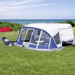 Sidestykker: Kan tages ud, indgangsdøren kan rulles til siden, vandrette hulsømme til stormstænger, store udluftningsvinduer med prægefolieafdækning, kan lukkes med lynlås. Der kan monteres en karnap på højre sidevæg.