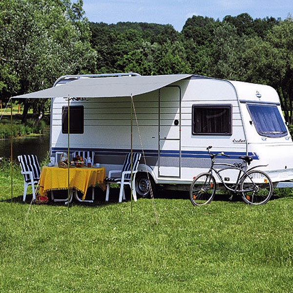 DWT Solsejl Flora giver dig pålidelig skygge og beskyttelse ved din campingvogn. Materialet er fremstillet af coated polyester, der er vandafvisende og slidstærkt – designet til at holde i varierende vejrforhold. Du får en komplet løsning, da leveringsomfanget inkluderer tag, opstillingsstænger i stål og opspændingsbarduner, så du ikke behøver at købe ekstra tilbehør.