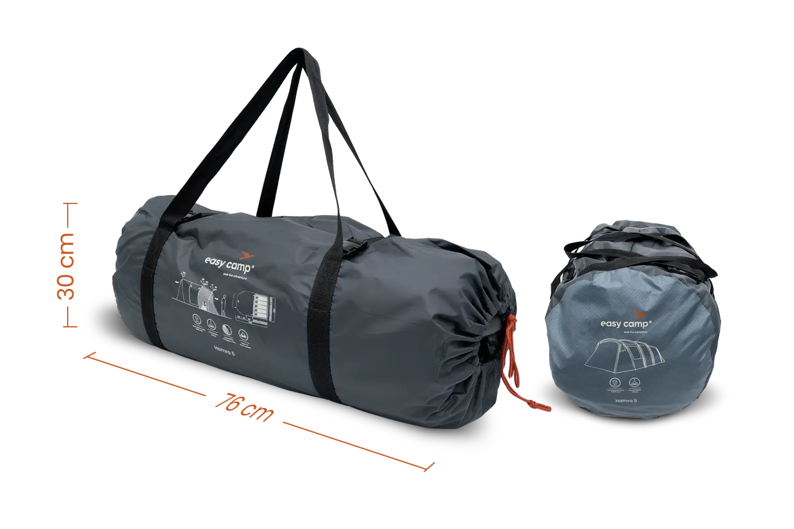 Easy Camp Hamra 5 kombinerer sikker vejrbeskyttelse med praktisk rumfordeling til fem personer. Teltet har et vandsøjletryk på 3000 mm med tapede sømme, hvilket giver pålidelig beskyttelse mod regn. Bunden er lavet af dobbeltbelagt, vandtæt polyethylen, som holder fugt ude fra underlaget. Med to separate sovekabiner og et opholdsrum med ståhøjde får familien både privatliv og bevægelsesfrihed. Opsætningstiden er 16 minutter komplet eller 9 minutter til indflytning, hvilket giver mere tid til selve campingturen. Teltet vejer 16,5 kg og har en pakket størrelse på 76 x 30 cm, så det kan transporteres uden at fylde hele bagagerummet. Konstruktionen med EnduraFlex glasfiberstænger på 12,7 mm sikrer god stabilitet, mens det åndbare polyesterindertelt forebygger kondensdannelse.