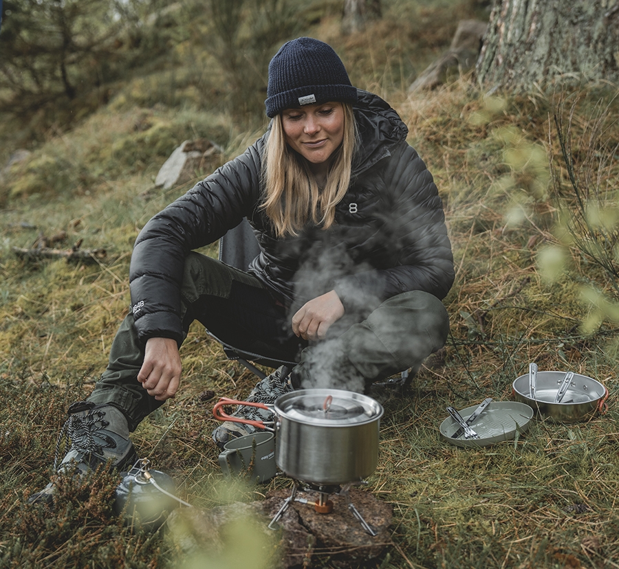 Hvis du planlægger campingture eller vandreture, gør dette sæt madlavning i naturen problemfrit. Med en vægt på kun 875 g er det let at bære i rygsækken under lange vandredage. Det stabelbare design reducerer pakkestørrelsen til 11,5 x 19,5 cm, så det passer i en campingrygsæk uden at optage værdifuld plads.