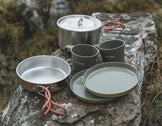• Inkluderet: 1 gryde, 1 låg, 1 pande, 2 krus, 2 tallerkener og mesh bæretaske