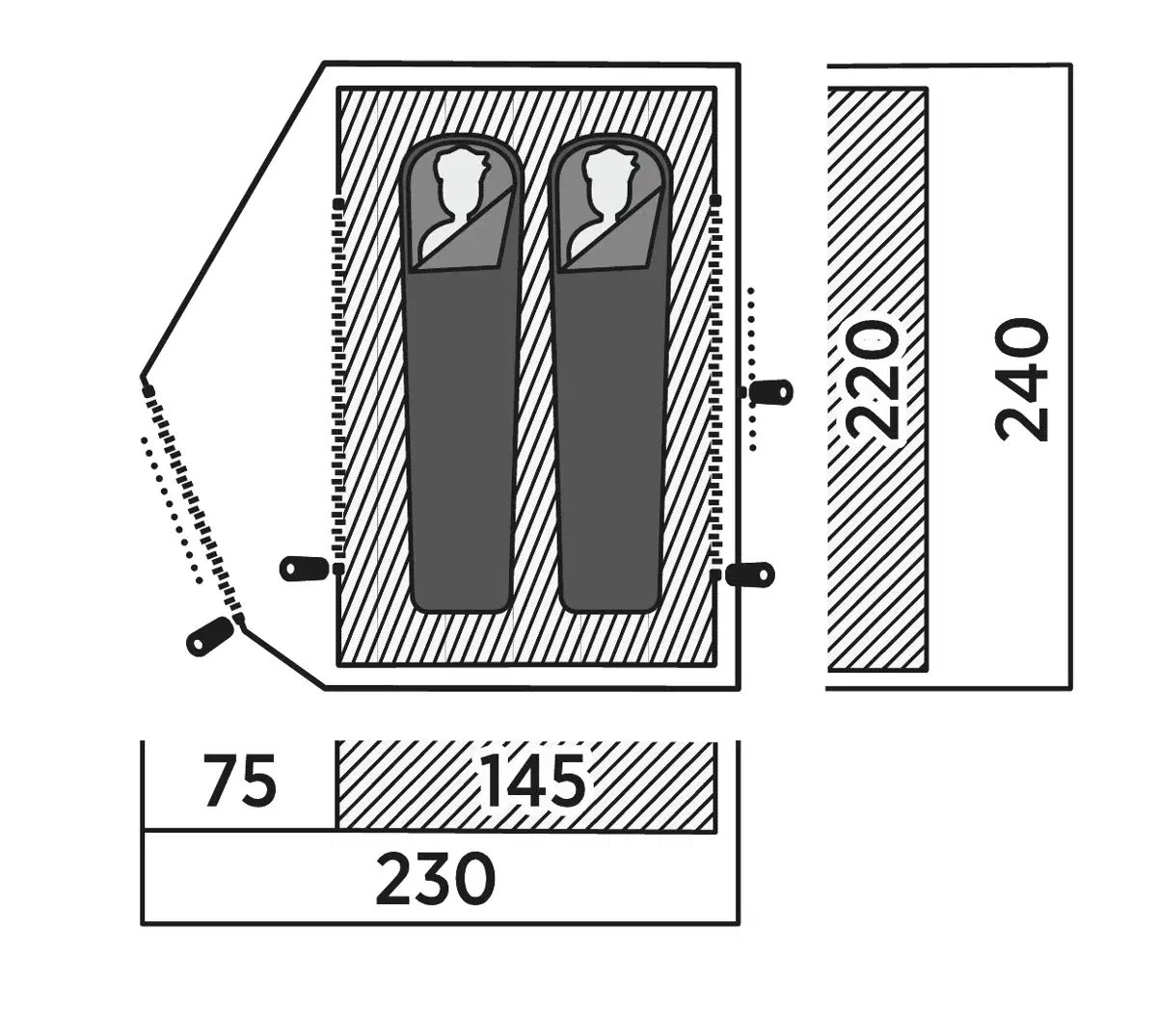 • Dimensioner: 240 cm længde, 230 cm bredde, 105 cm højde