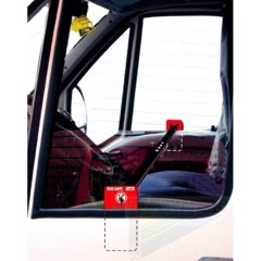 Person installerer sikkerhedsbøjle i camper, spænder døre fra indersiden, label synlig.