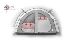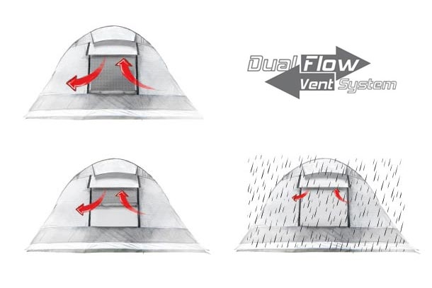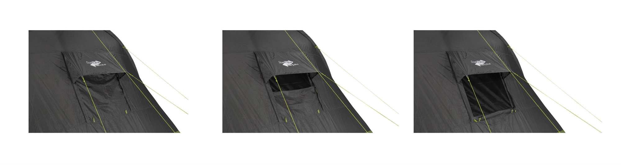 Det permanente ventilationssystem Dual Flow regulerer luftstrømmen gennem teltet og reducerer kondensdannelse. Systemet arbejder sammen med det åndbare polyester, som har en alu/PU-belægning, der reflekterer varme. Oversejlet har en specialbelægning, der beskytter mod direkte sollys. To indgange med myggenet giver fleksibel adgang og sikrer gennemtræk på varme dage. PVC-vinduer med gardiner giver mulighed for at regulere lysindfald og privatliv. Denne kombination af ventilationsløsninger betyder, at temperaturen inde i teltet forbliver mere behagelig, både når solen står højt, og når luftfugtigheden stiger om aftenen.