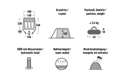 • Dimensioner telt: L340 x B180 x H105 cm