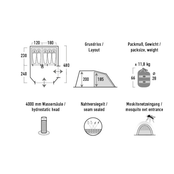 Teltet har fuld ståhøjde - 200 cm i vestibule og op til 185 cm i sovekabine. Der er ekstra meget plads mellem teltdugen og inderteltet, og der er i sovekabinen ligeledes ekstra store ventilationsområder, der sikrer et skønt og behageligt indeklima.
