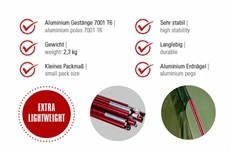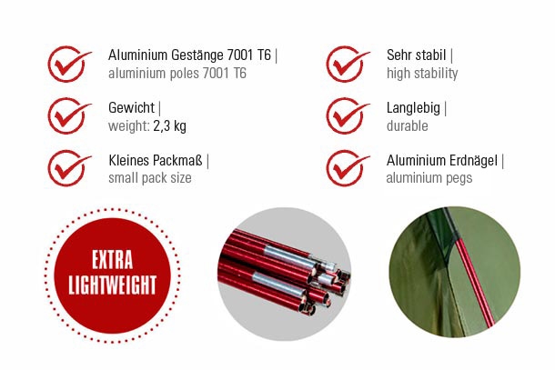 • Teltstænger: 7,9 mm. kvalitets Aluminium 7001 T6