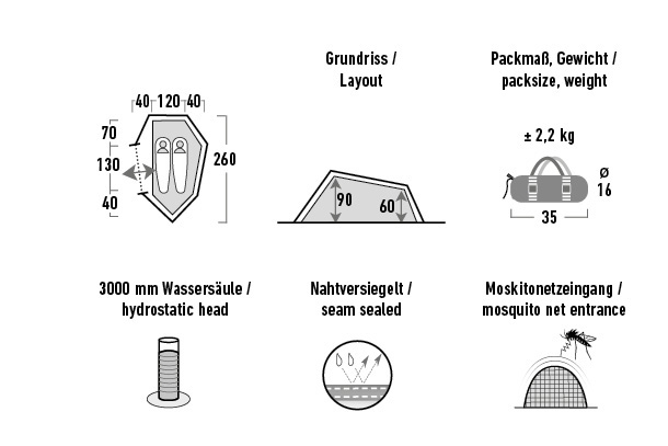 Teltet har en samlet vægt på 2,8 kg, hvilket gør det minimalt belastende for din rygsæk på lange ture. Den ekstra brede indgang giver nem adgang, også når du har udstyr med dig. Farvemarkerede stænger i kvalitets Aluminium 7001 T6 sikrer høj vindstabilitet, hurtig og fejlfri opsætning, selv hvis du er træt eller i dårligt vejr. Inderteltet er lavet af åndbart polyesterstof, som reducerer kondens, mens bunden holder dig tør fra fugtige områder. Indvendige lommer giver praktisk opbevaring af nødvendigheder som telefon, kort og lommelygte, og lampeholderen komfortbelysning i teltet.