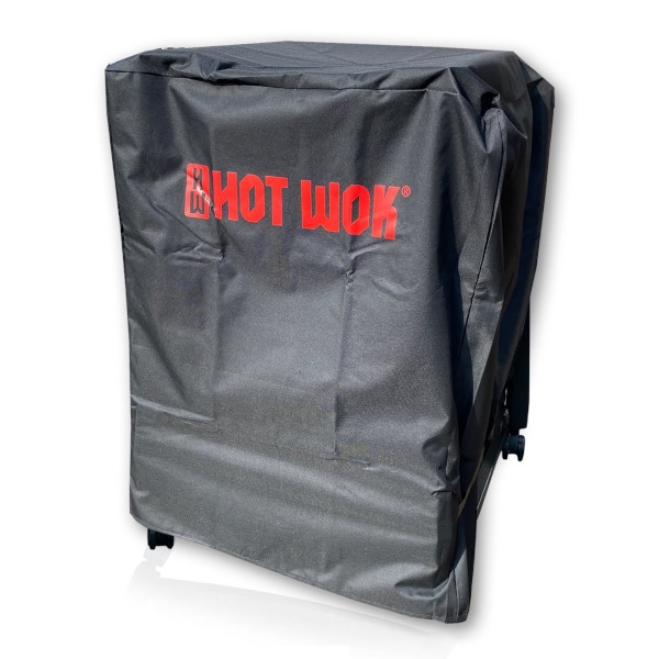 Sort betræk med rød "HOT WOK" logo, omslutter genstand helt, synlige syninger.