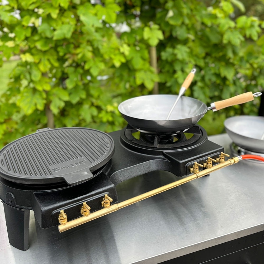 Med en kraftfuld effekt på 2 x 10 kW giver dette professionelle gasblus dig mulighed for at opnå ægte wok hei i dine retter. De to isolerede brændere lader dig tilberede forskellige retter samtidigt, mens tre individuelle haner pr. blus sikrer præcis varmestyring. Det er ideelt til travle køkkener, hvor høj varme og fleksibilitet er afgørende.