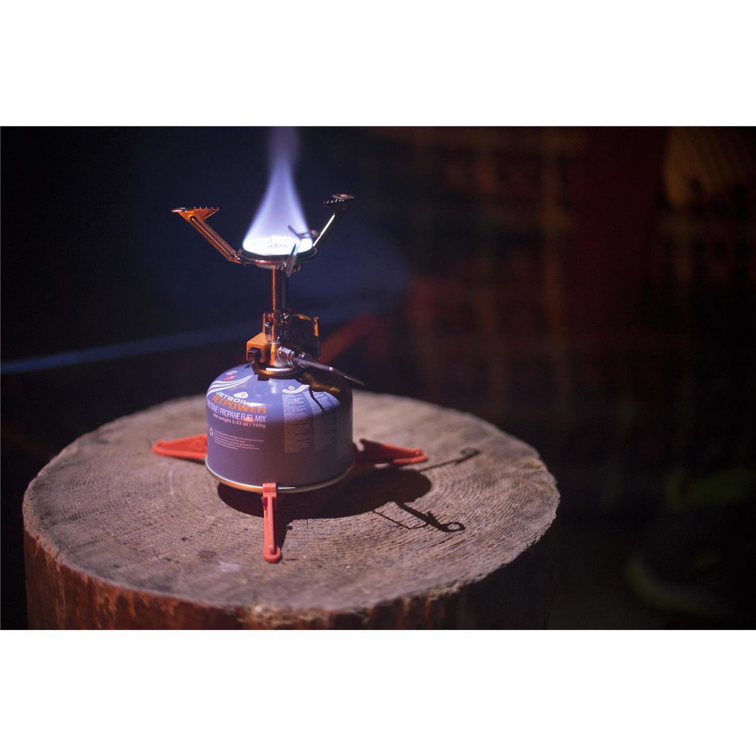 Med en vægt på kun 95 gram er JETBOIL MightyMo Brænder den ideelle letvægtsløsning til dine outdoor-eventyr. Den kraftfulde 3.000 watts brænder koger en liter vand i en gryde med FluxRing, på 180 sekunder , hvilket sparer både tid og brændstof på dine ture. Takket være den pålidelige piezo-tænding starter brænderen med ét tryk på knappen, selv i koldt vejr ned til -6 grader. Trykregulatoren sikrer en stabil flamme under alle forhold, og de medfølgende støtteben til din gasdåse giver solid stabilitet til dit kogegrej. Med et brændstofforbrug på 12 liter vand per 100 g gas får du maksimal udnyttelse af din gasdåse (EN 417).