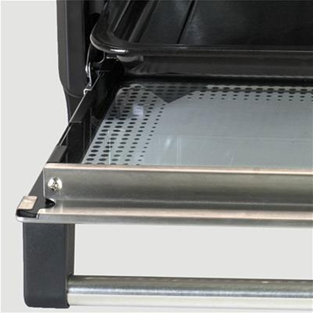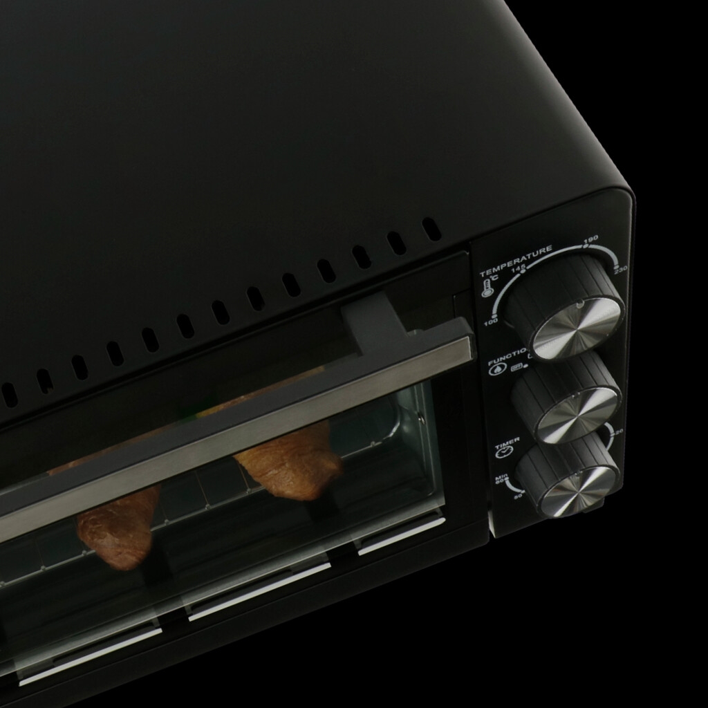 Ovnens mål på 43 x 34,5 x 28,5 cm gør den nem at placere på køkkenbordet, mens vægten på 6,5 kg betyder, at du kan flytte den mellem hovedboligen og fritidsboligen uden besvær. Den dobbeltrudede dør forhindrer varmetab og holder ydersiden køligere at røre ved. Overophedningsbeskyttelsen sikrer tryg brug, selv når du ikke holder konstant øje med ovnen.