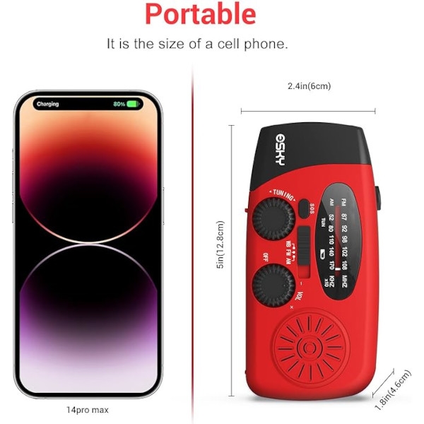 Rød nødradio med USB-opladning, solcelle og håndsving til strøm.
