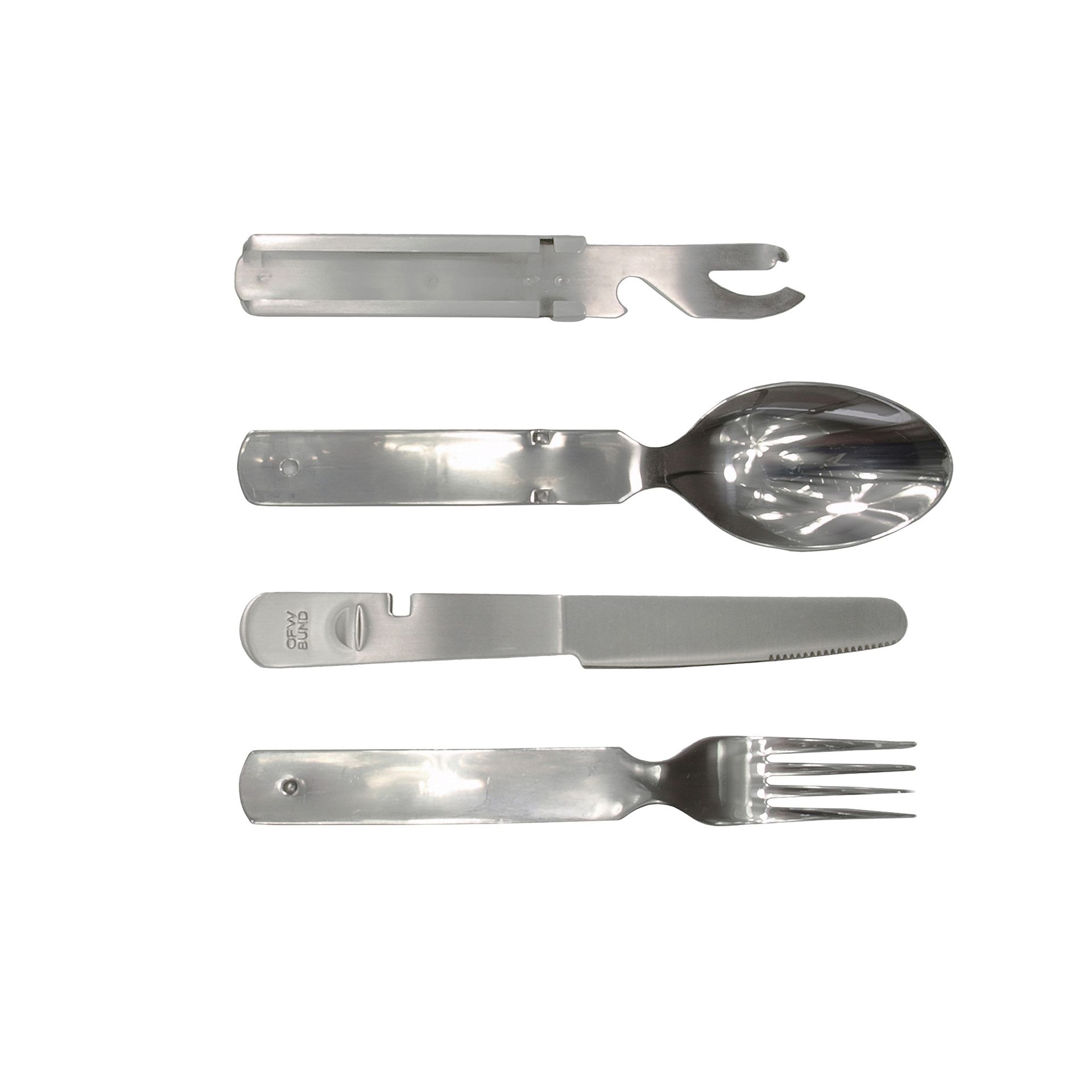 Dette bestiksæt fra Otto Förster Wuppertal indeholder kniv, gaffel, ske samt dåse- og flaskeåbner i ét kompakt sæt. Fremstillet af rustfrit stål, udviklet til det Tyske militær sikrer det lang levetid uden rust, hvilket er vigtigt for hyppig brug i naturen. Med en vægt på kun 195 g og dimensioner på 19,2 x 2,2 cm reducerer det behovet for ekstra værktøj i din rygsæk.