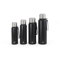 Sort termoflaske 1,5 l med mat finish, aftageligt låg og bærestrop.