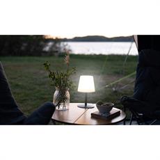 Smukt designet bordlampe med fire lysindstillinger fra intens hvidt arbejdslys til varm hvid og stemningsfulde farver, der giver dig fleksibel belysningsmuligheder for ved bordet, sofagruppen eller i forteltet. Det kraftige 2000 mAh lithiumbatteri sikrer strøm til flere dages brug via USB-C-opladning. Den robuste konstruktion tåler støv og vandstænk, mens det praktiske adskillelige design sparer plads i campingvognen når den ikke bruges. Den medfølgende pakkepose sikre den mod slid og holder delene samlet under transport. Lampens højde på 27 cm giver god arbejds- og hyggebelysning, og den vejer kun 726 gram.