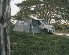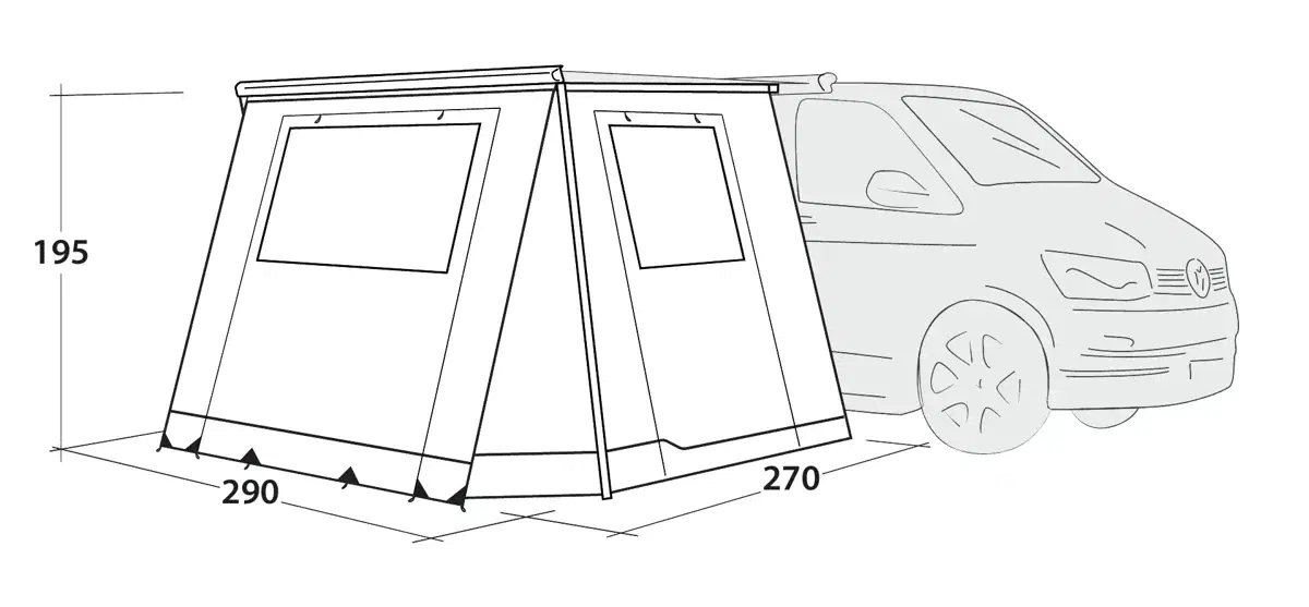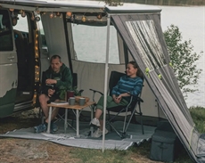 Dette fortelt forbindes direkte til din campervans markise og udvider det brugbare rum med 290 x 270 cm gulvplads. Vandsøjletrykket på 4.000 mm beskytter mod kraftig regn, mens konstruktionen i Outtex 4000 Select polyester håndterer gentagen brug i skiftende vejr. Kompatibiliteten med Thule 5200, Fiamma F45s og Dometic PW1100-markiser samt VW T5/T6/T6.1 og MB W639/W447-modeller sikrer korrekt pasform uden tilpasningsproblemer. Tagforbindelseslængden på 240 cm og tilslutningshøjden mellem 175-200 cm matcher standardopsætninger på disse køretøjer. Den PFAS-fri vandafvisning, kombineret med UV-beskyttelse UPF 30+, giver beskyttelse uden miljøbelastende kemikalier. Store tonede sidevinduer slipper dagslys ind og bevarer samtidig privatlivet på campingpladsen. De forudmonterede lysende barduner gør opsætning mulig selv efter mørkets frembrud, hvilket er praktisk ved sen ankomst. Siderne lynes fast på markisestængerne.