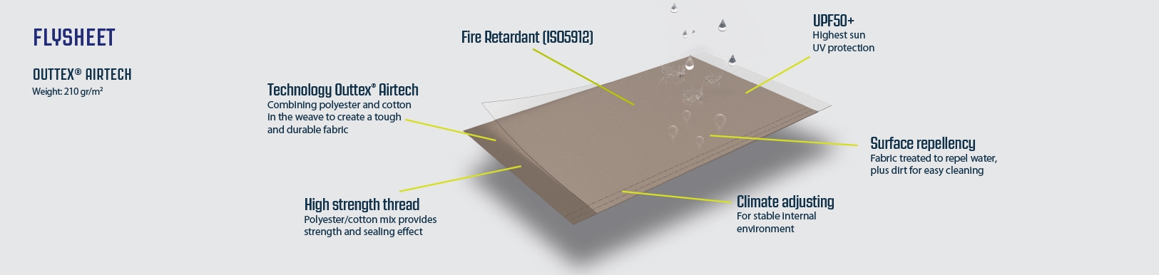 Fugt fra jorden trænger ofte ind gennem bundlaget og skaber ubehag om natten. Det dobbeltbelagte polyethylenbundlag beskytter mod dette problem. Vi anbefaler altid at tilkøbe et teltunderlag for beskyttelst mod skarpe sten som man ofinder på kampingpladsen. Dette forlænger teltets levetid. Dårlig ventilation fører til kondens på varme sommerdage, men de to døre med mesh-paneler sikrer luftcirkulation. Polycotton-stoffet i bomuld reducerer kondens yderligere og skaber et behageligt indeklima ved længere ophold i naturen, specielt i varme egne.