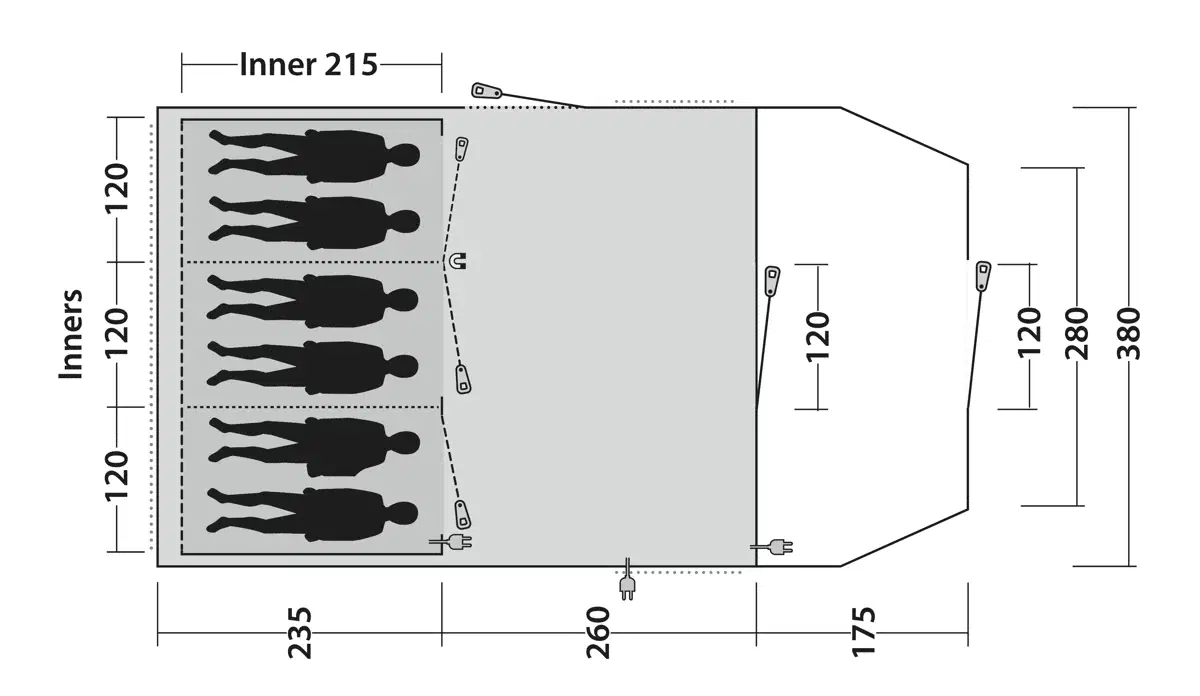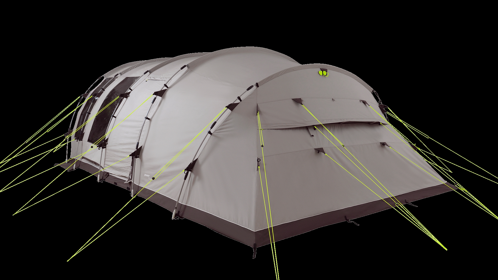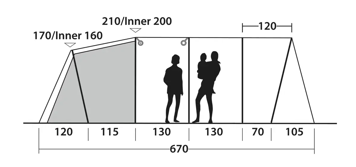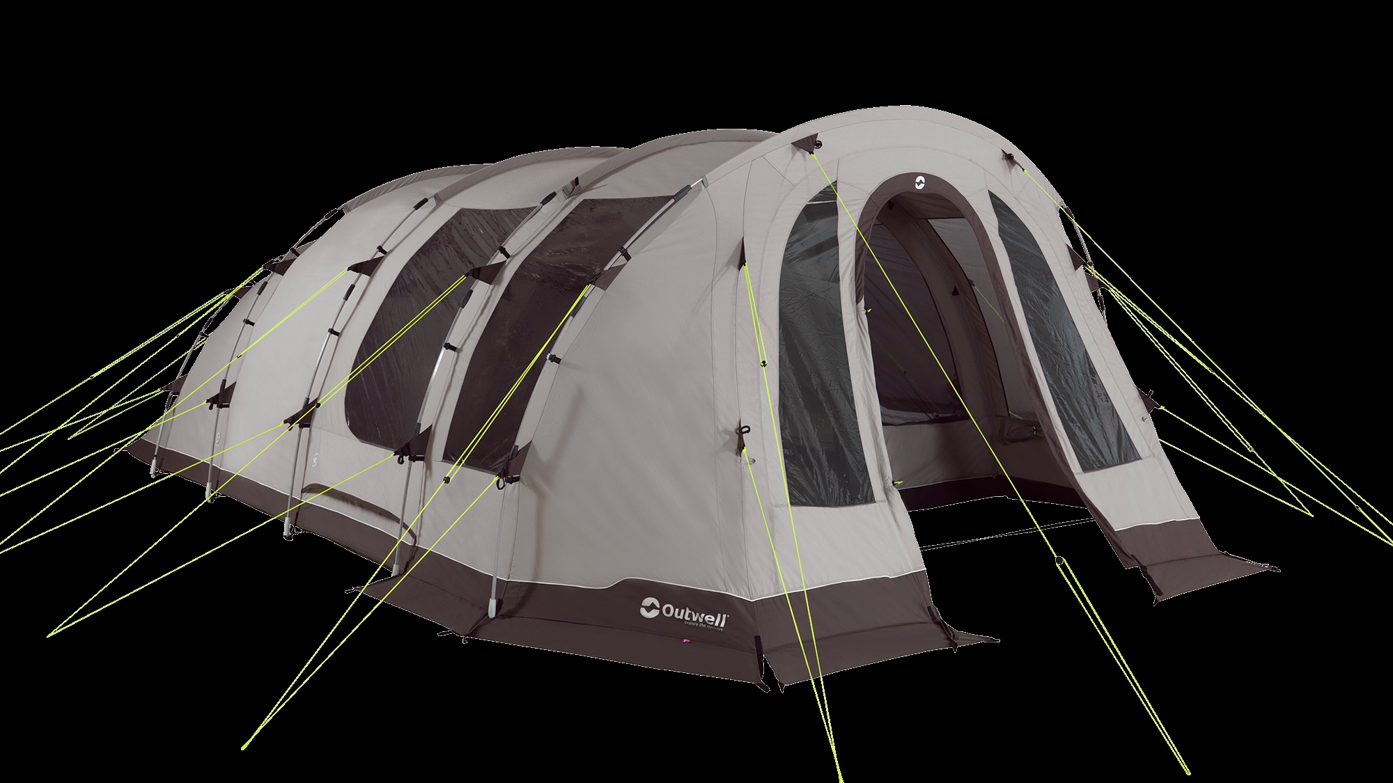 Forrum, opholdsstue og soveafdeling fungerer som separate områder, der imødekommer forskellige behov. Forrummet giver plads til opbevaring af vådt tøj, sko løbehjul m.m. og møbler uden at bringe snavs ind i opholdsstuen. Opholdsstuen fungerer som fællesområde, hvor familien kan spise og opholde sig, mens de to sovekabiner giver privatliv til børn og voksne. Denne opdeling reducerer rod og skaber struktur i hverdagen på campingpladsen. Det integrerede Outwell Light System med justerbar belysning gør det nemt at navigere mellem zonerne efter mørkets frembrud. Flere opbevaringslommer er intigreret i teltet for at holde styr på småting.