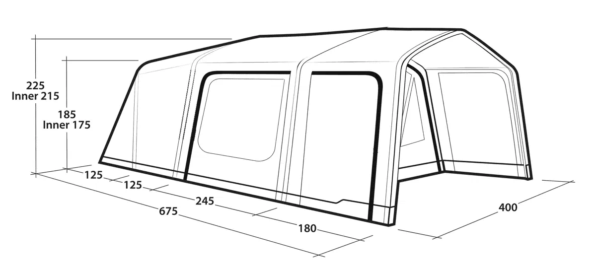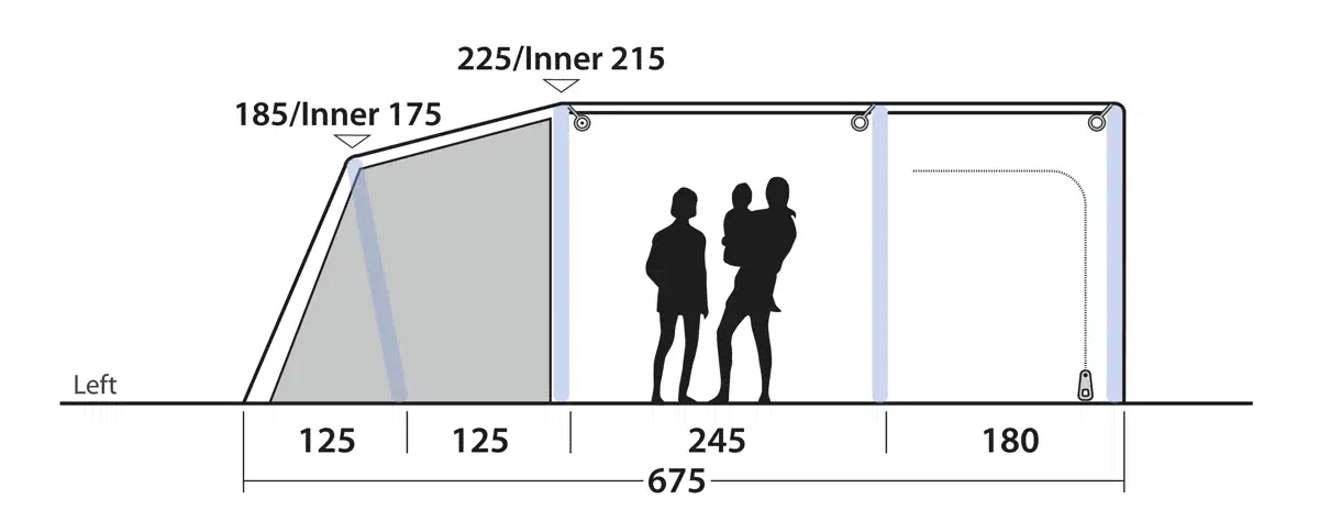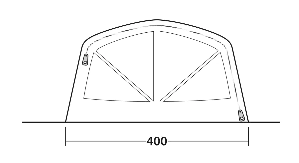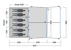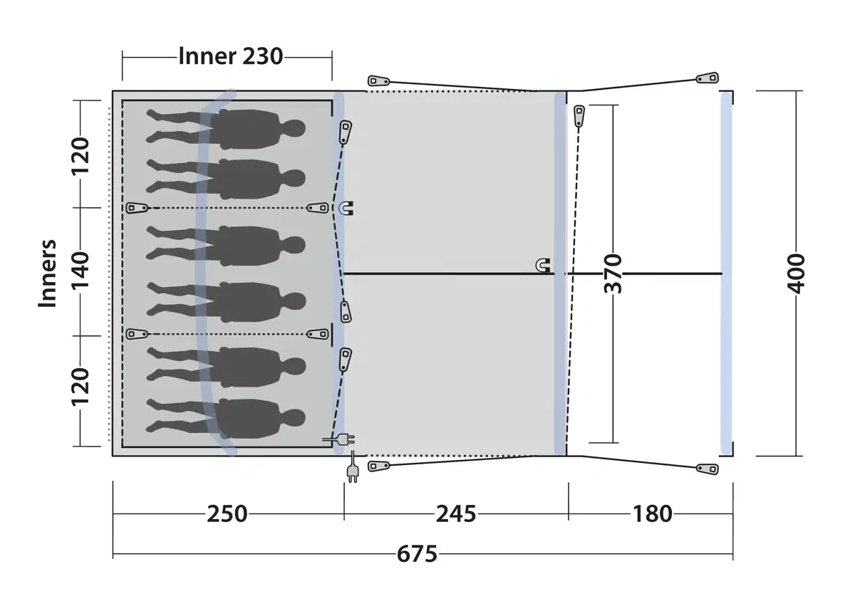 Tunnelteltets tre-rums konstruktion består af to mørke Ambassador-soveværelser på 230 cm og en central stue. De separate soveområder giver familier mulighed for at opdele børn og voksne, mens grupper af venner kan fordele sig efter behov. De ekstra mørke sovekabiner blokerer tidligt morgenlys, hvilket forlænger søvnen efter en dag med aktiviteter eller lang nat på festivallen. Mesh-ventilation i sovekabinerne sikrer god luftcirkulation uden at lukke insekter ind. Stuen fungerer som fælles opholdsrum med tilstrækkelig loftshøjde til at stå oprejst, takket være forformede luftslanger. Frontvæggen har både mesh- og PVC-vinduer med separate gardiner, så ventilation og privatliv kan justeres efter vejrforhold. Sidedøre med insektbeskyttende mesh giver adgang til opbevaringsområder uden at kompromittere komforten indvendigt. Indvendige mesh-lommer holder småting organiseret og let tilgængelige. Outwell Light System med 200 cm LED-længde giver justerbar belysning til aftenaktiviteter op til 560 lumens. Aluminium teleskopstænger i taget tilfører ekstra stabilitet, særligt ved blæsende vejr.