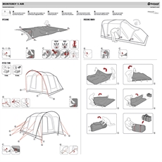 Monterey 4 Air's rumopdeling med tre separate områder giver fleksibilitet til både opbevaring og overnatning. Luftkanalsystemet sikrer en stabil konstruktion, der kan modstå vind. Ventilationsåbningerne er placeret strategisk for at regulere luftcirkulationen i teltet. Den buede frontdel og forteltet skaber ekstra plads til udendørs aktiviteter. Det åndbare polyesterindertelt bidrager til et behageligt indeklima.