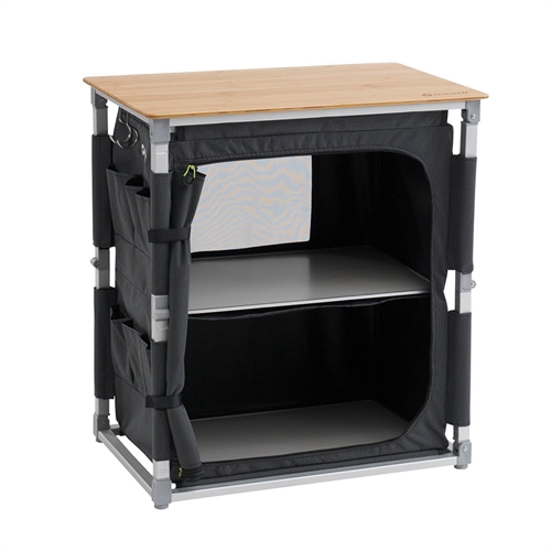 Dette praktiske opbevaringsskab åbnes og foldes på få sekunder, hvilket gør det ideelt til campinglivet. Med to hovedrum, seks opbevaringslommer og en robust bambusplade på toppen får du en effektiv opbevaringsløsning. Skabet er udstyret med net til luftcirkulation, der forebygger fugt og lugt, samt en udtrækkelig holder til opvaskebalje. Du kan bl.a. bruge bordpladen til køkkenbor og evt. til en gasbrænder.