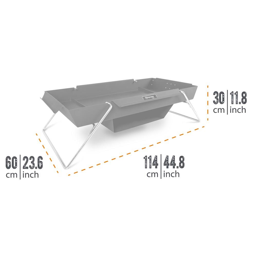 Den aflange form måler 30 × 114 × 60 cm, hvilket giver god plads til flere bål og forskellige madlavningsmetoder. Kombinér bålfadet med med en Petromax Fire Bridge vil du få det absolutte bedste udgangspunkt for din outdoor madlavning. Bagekammeret har indvendige mål på 11,4 × 46,5 × 35,5 cm. og dimensioneret til Petromax Fire Skillets fra FP15 til FP30, Grill Fire Skillet GP35-T samt Loaf Pans K4 til K8 (uden låg). Denne fleksibilitet gør Fire Trough til alsidigt udekøkken