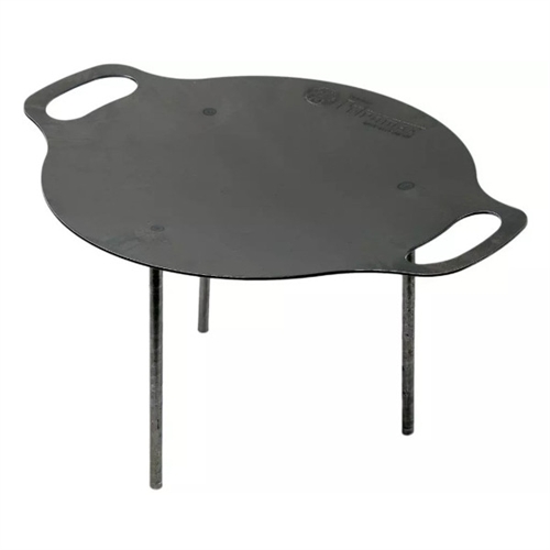 Rund griddle med to håndtag og tre ben til støtte. Flad overflade til madlavning.