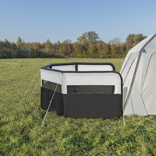 Det granit/sorte læsejl er fremstillet i holdbart polyester 150D, der modstår forskellige vejrforhold. Stabiliserende barduner og pløkker sikrer solid forankring, mens de gennemsigtige vinduer bevarer kontakten med omgivelserne. Det oppustelige design gør opsætningen enkel og hurtig.