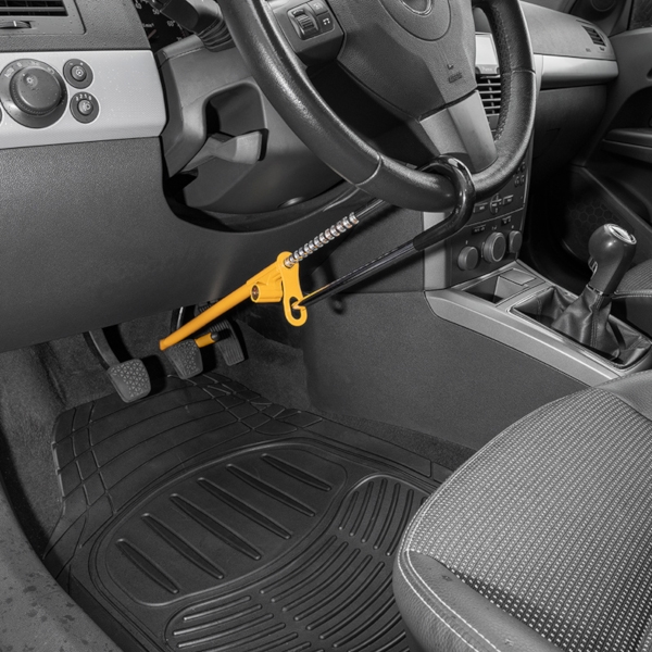 Solid ratlås fra ProPlus. Ratlåsen monteres på rattet i den ene ende og ned om bremsepedalen med den anden ende.