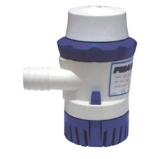 Cylinderformet vandpumpe i hvid/blå med 14 l/min, 0,5 bar, 12V D.C. specs synlige.