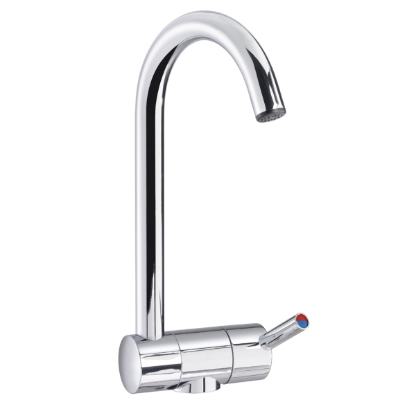 Slank og moderne armatur med høj bue, enkelt greb og kromlignende finish.