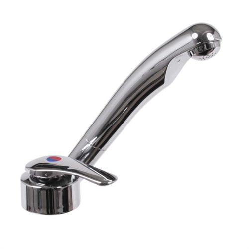 Kromarmatur med buet tud og enkelt greb til varmt og koldt vand.