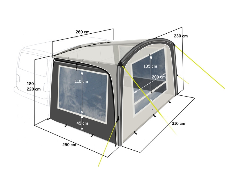REIMO Antigua Air solsejl til fx. VW-bus og autocamper er et praktisk fortelt med hurtig opstilling via én luftslange. Det har store vinduer med gardiner og kan monteres med både vulst ø5 eller 8 mm, låsestang og løkker. Sidevæggene fastgøres og fronten har lynlås. Solsejlet passer til køretøjer med højde fra 180 til 220 cm og har et vandsøjletryk på 3.000 mm for effektiv beskyttelse mod regn.