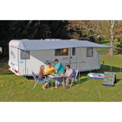 Lysgrå markise med blå kant på campingvogn. Campingstole og bord på græs.