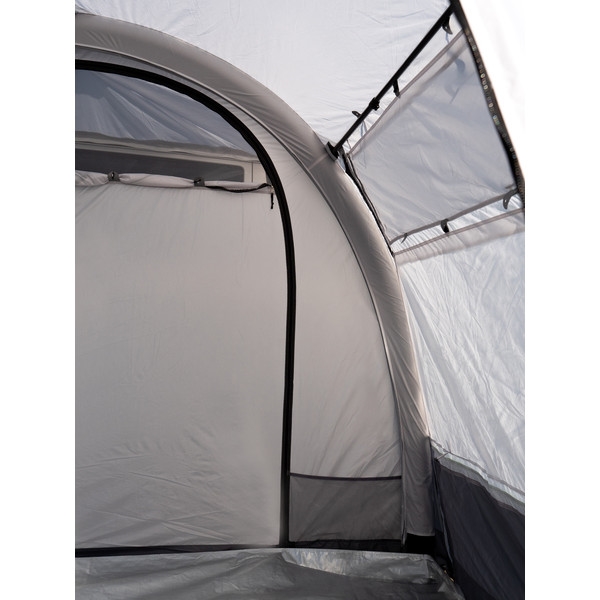 Grå oppustelig telt tilsluttet camper i grønt område med støtte-liner og frontdør.