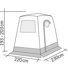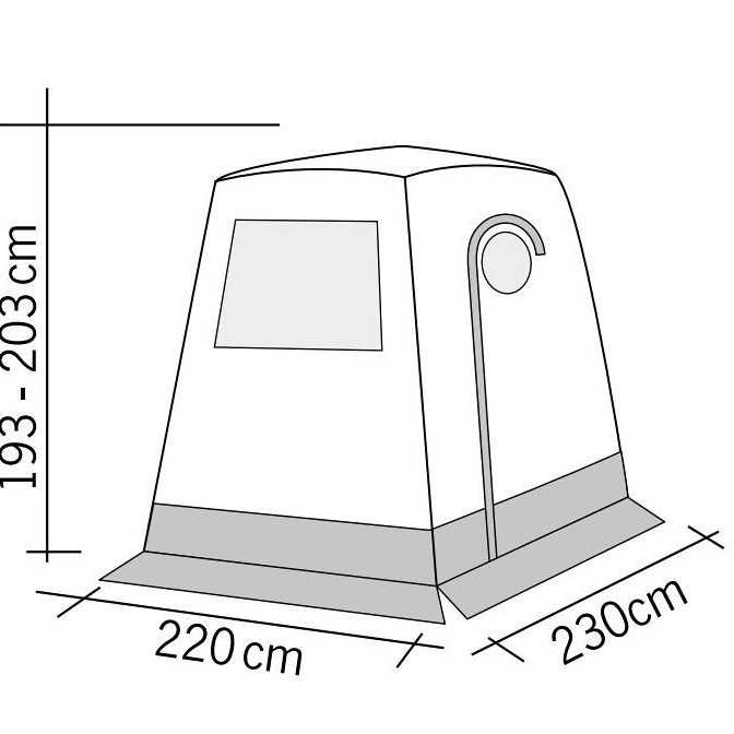 Fremstillet i holdbart 190T polyester med en rummelig størrelse på B:220 x D:230 x H:193-203 cm. Det kompakte pakkeformat på 95 x 20 x 22 cm gør transport og opbevaring nemt. Tagvindue og dørvindue sikrer godt naturligt lys, mens den grå farve passer til de fleste vans.