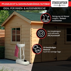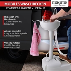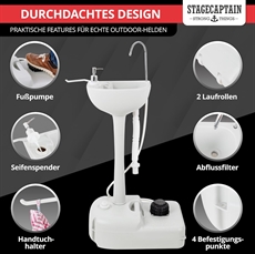 StageCaptain leverer funktionelt campingudstyr til udendørs entusiaster. Med denne campinghåndvask får du mobilitet gennem hjulene, så du kan placere vasken præcis, hvor du har brug for den – ved teltet, køkkenområdet eller toilettet. De 4 monteringsmuligheder giver ekstra stabilitet, mens den lysegrå PE-plast sikrer holdbarhed under forskellige vejrforhold.