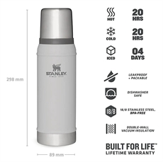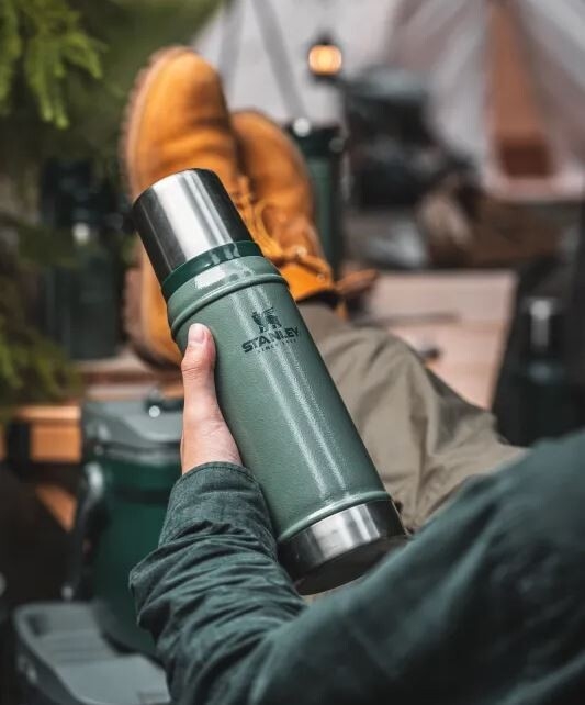 STANLEY Legendary Classic Termokande er måske en af verdensbedste og med op til 20 timers varmeisolering giver den dig varme drikke under fx. strømafbrydelser eller på campingture uden kogemuligheder. Twist-and-pour-stopperen lader dig hælde uden at fjerne låget -praktisk når du kører eller har kolde hænder. Det isolerede låg fungerer som drikkekop, så du slipper for ekstra udstyr. Alle dele kan rengøres i opvaskemaskinen, hvilket sparer tid efter turen. Den kende grønne hammerlak tåler stort slid og giver termokanden det flotte klassiske look.