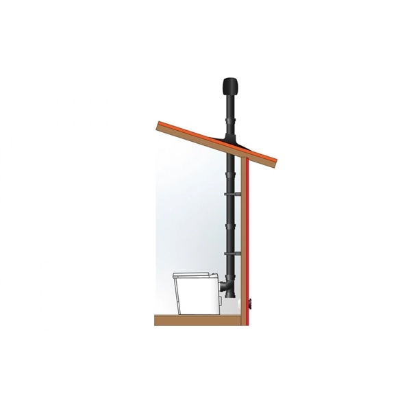 Komplet ventilationspakke til dit forbrændingstoilet med alle nødvendige komponenter til sikker installation. Systemet er designet med fokus på effektiv ventilation og fugtsikring. Den vandtætte tagmanchet forhindrer fugtskader, hvilket er særligt vigtigt i uopvarmede fritidsboliger og på byggepladser.