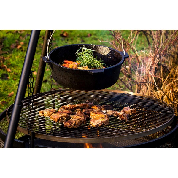 Denne robuste støbejernsgryde er skabt til udendørs madlavning med sin udmærkede varmefordeling og holdbare konstruktion. Med en rummelig kapacitet på 5,5 liter kan du tilberede mad til større selskaber, hvad enten det er over bål eller grill. Gryden er nem at rengøre og vedligeholde, selv under primitive forhold.