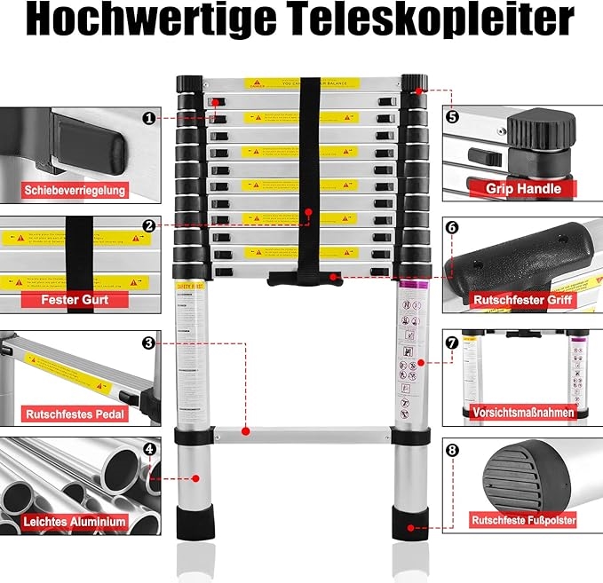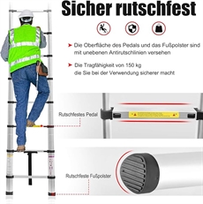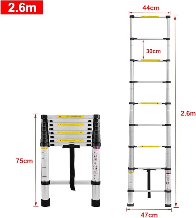 Denne teleskopstige giver dig sikker adgang til højder op til 2,6 meter, mens den kun fylder 0,75 meter sammenfoldet. Med 9 trin kan du justere præcist til den højde, du har brug for - om det er til camper, caravan eller i hjemmet. Hvert trin låses automatisk, så stigen ikke kan klappes sammen utilsigtet under brug. Aluminiumskonstruktionen er rustfri og holder til 150 kg, hvilket giver plads til dig og dit værktøj.