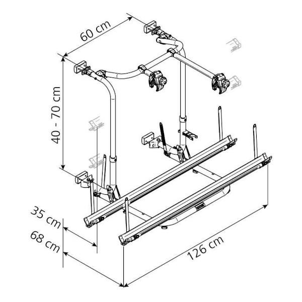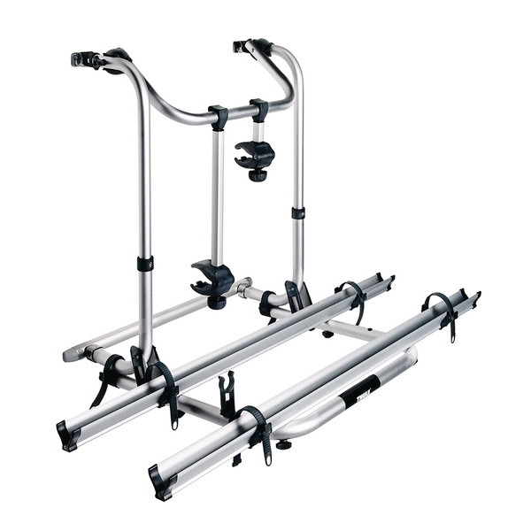 Cykelholder med justerbare skinner og støttearme, designet til montering bag på campingvogne.